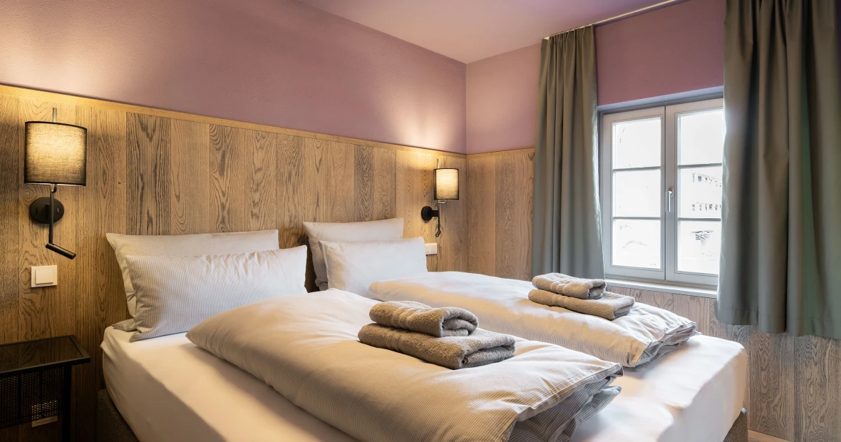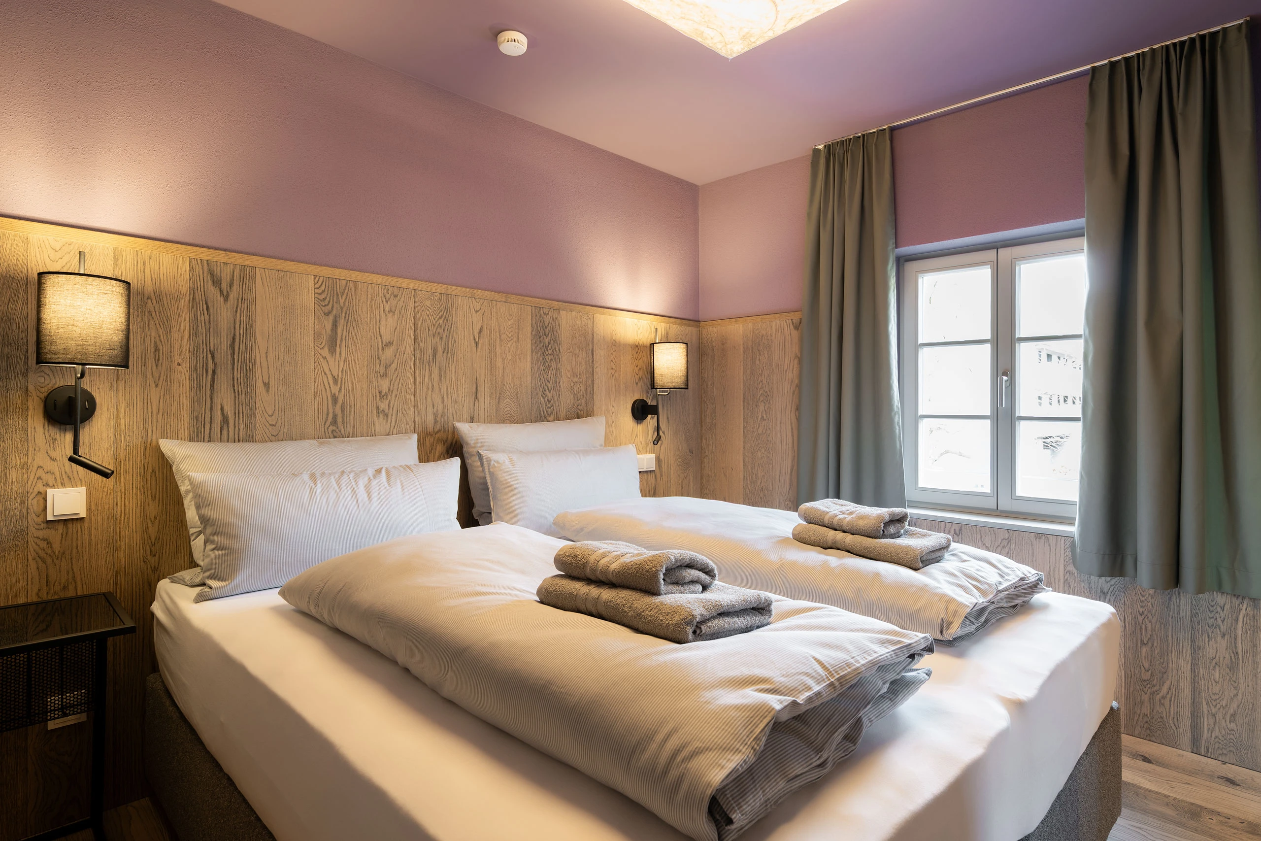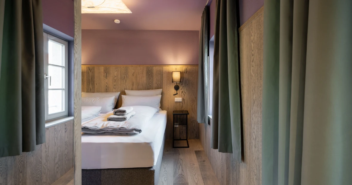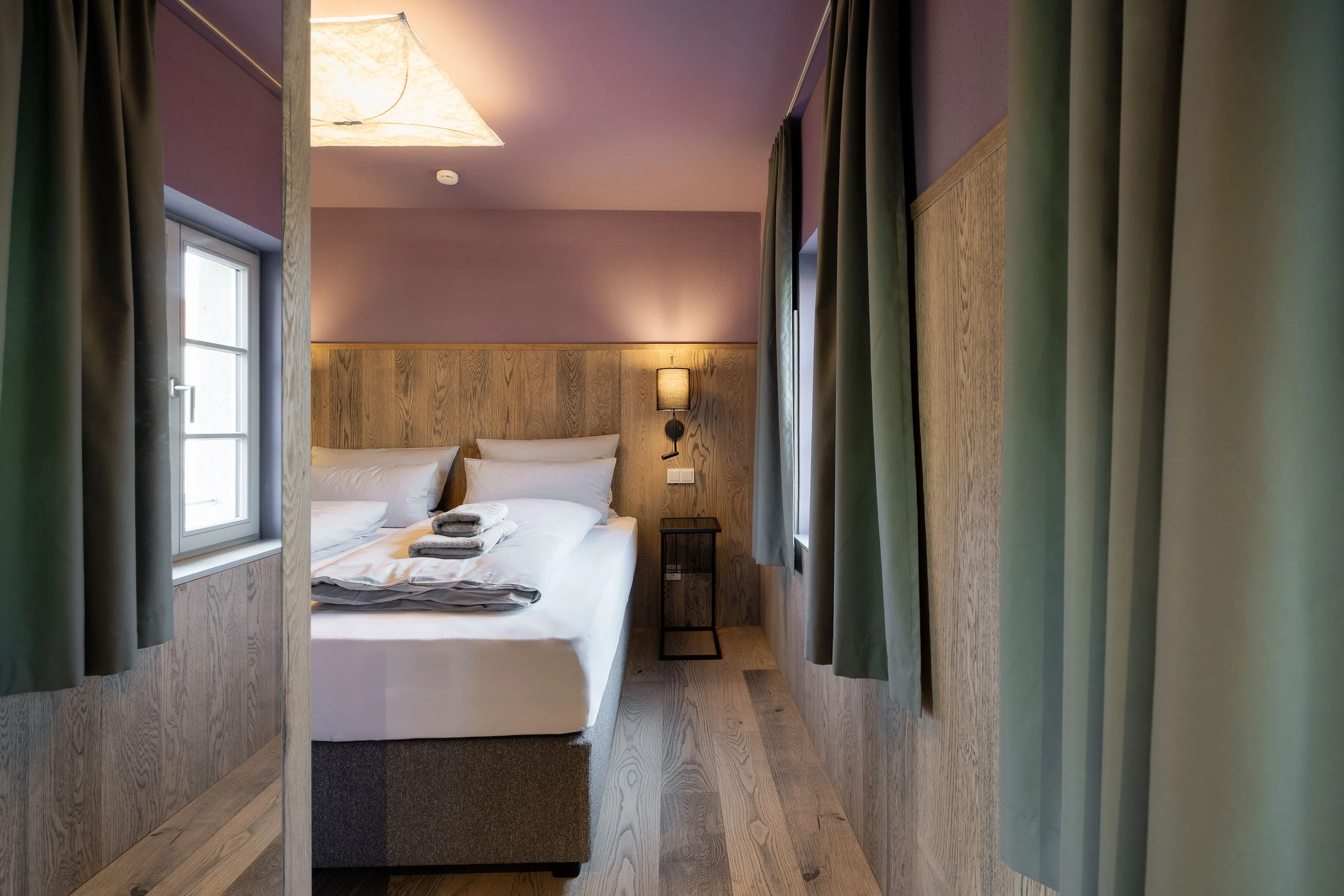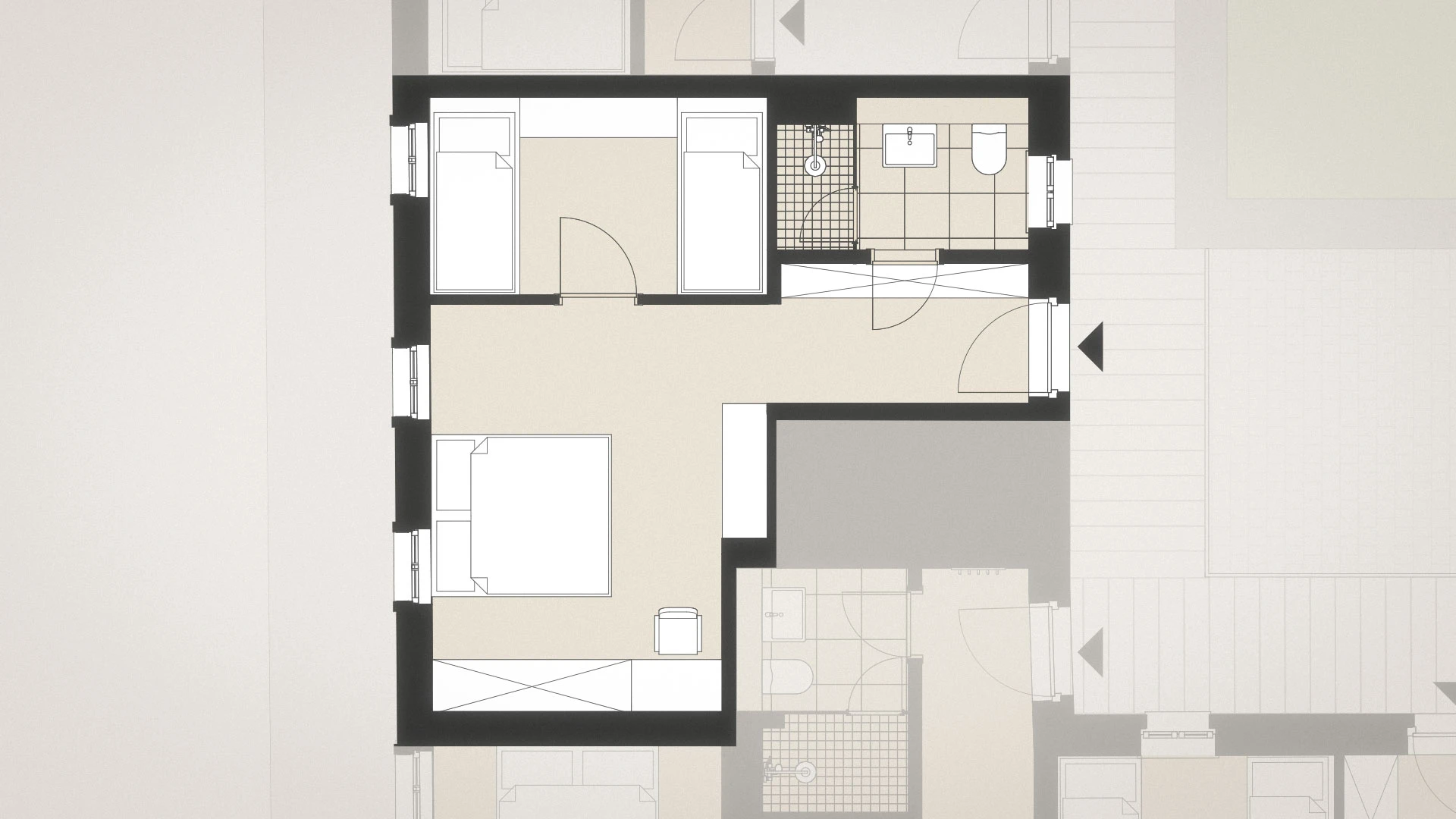 Zwei getrennte Einzelbetten ergänzen sich zu einem Quartier für vier. Durchdacht und praktisch, mit Blick für Privatsphäre. Das Bad mit Tageslicht bringt Frische, die klare Raumaufteilung sorgt für innere Ordnung. Ideal für ruhige Nächte nach lebendigen Tagen.