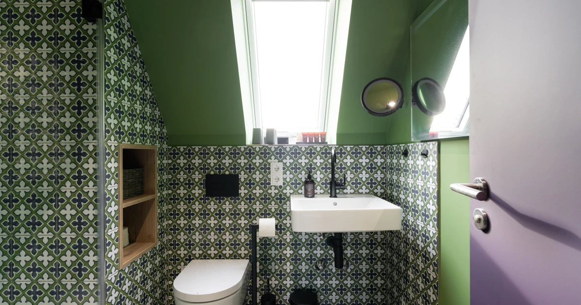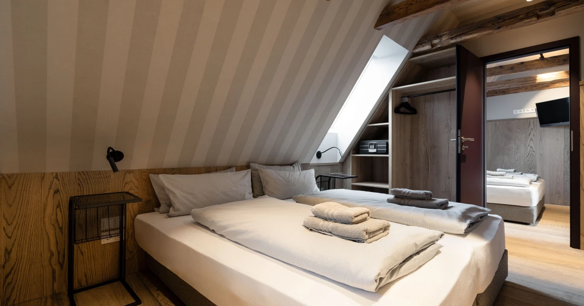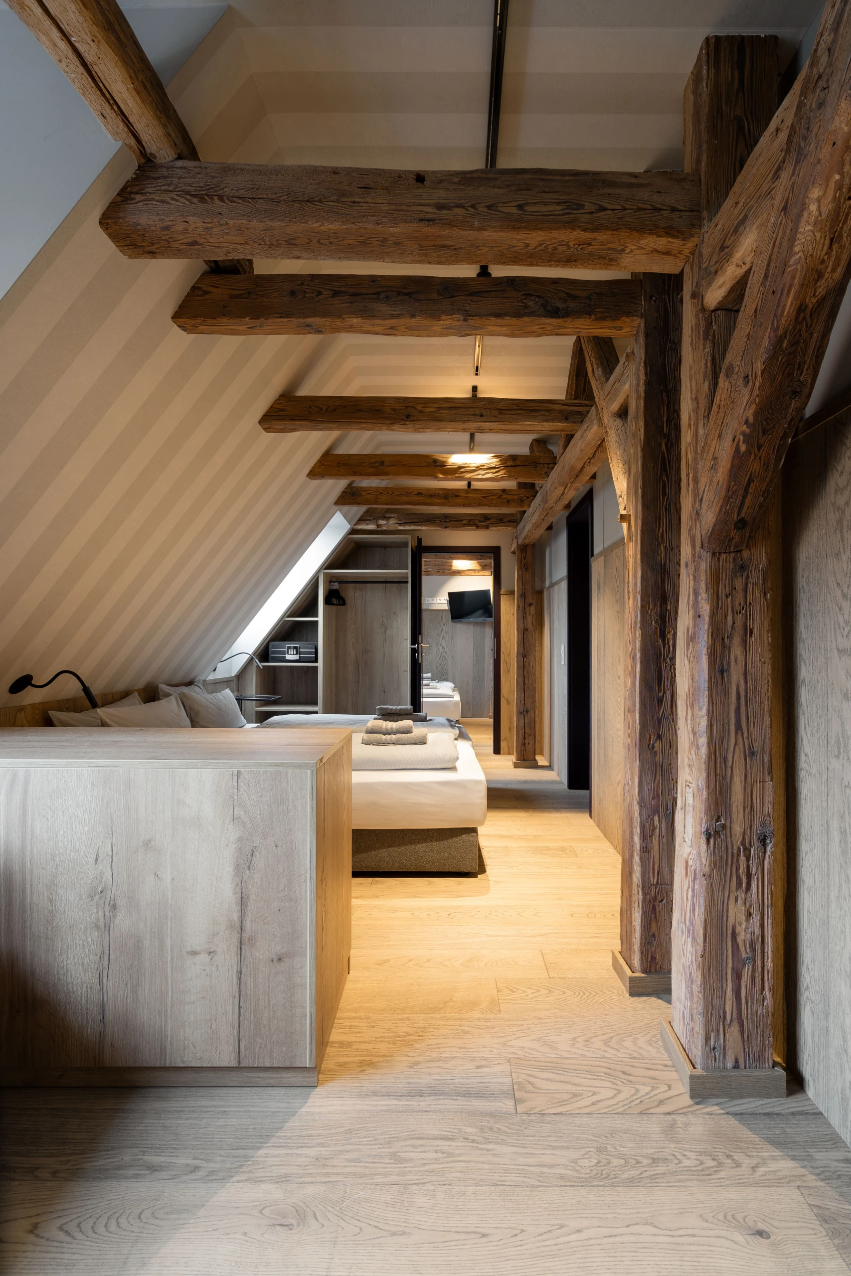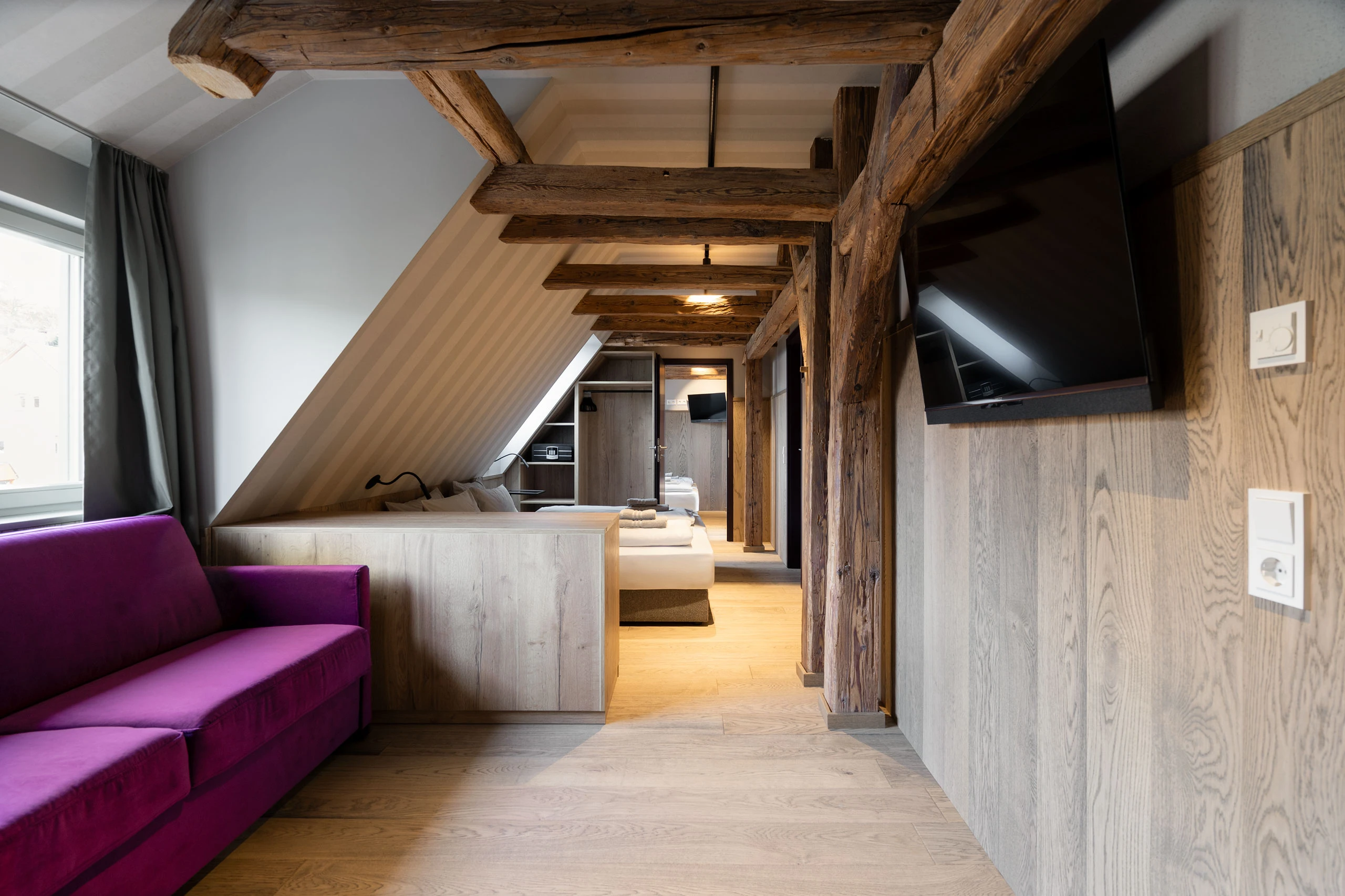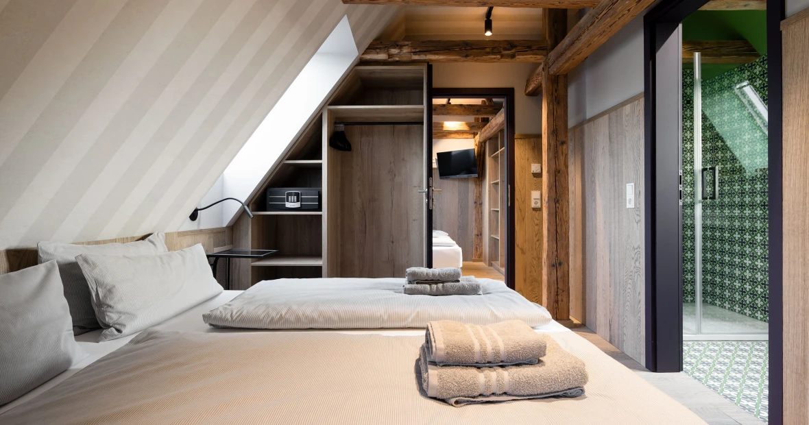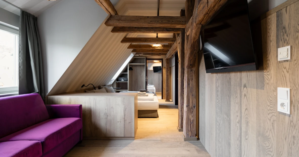 Hoch oben unterm historischen Dach entfaltet sich ein besonderer Rückzugsort: warmes Holz, sichtbares Tragwerk aus alten Balken, ein weicher Holzboden – alles durchdrungen von Licht und Weite. Die großzügige Gaube eröffnet einen atemberaubenden Blick über die „Schöne Höhe“. Zwei Bäder bieten Komfort, der separate Wohnbereich mit Sofa und TV lädt zum Verweilen ein. Hier ist Platz für bis zu sechs Personen – und genug Raum für Ruhe, Gespräche, Gedanken und Geschichten. Ein echtes Refugium über den Dingen.