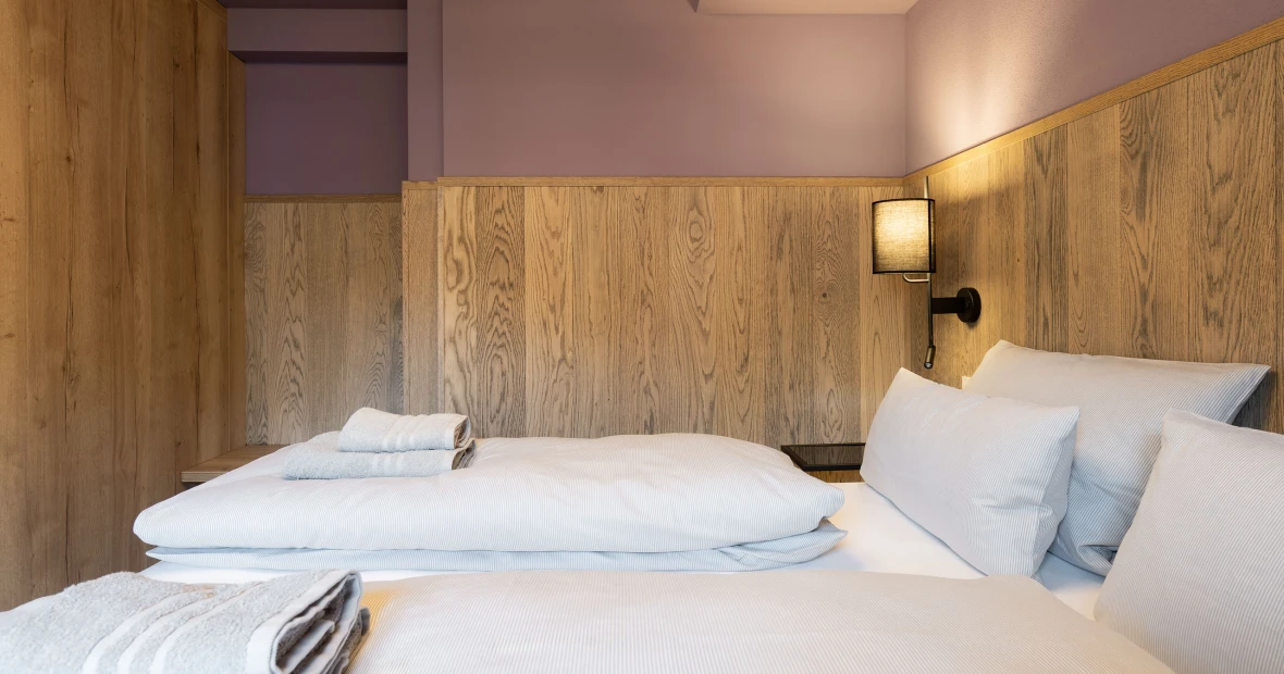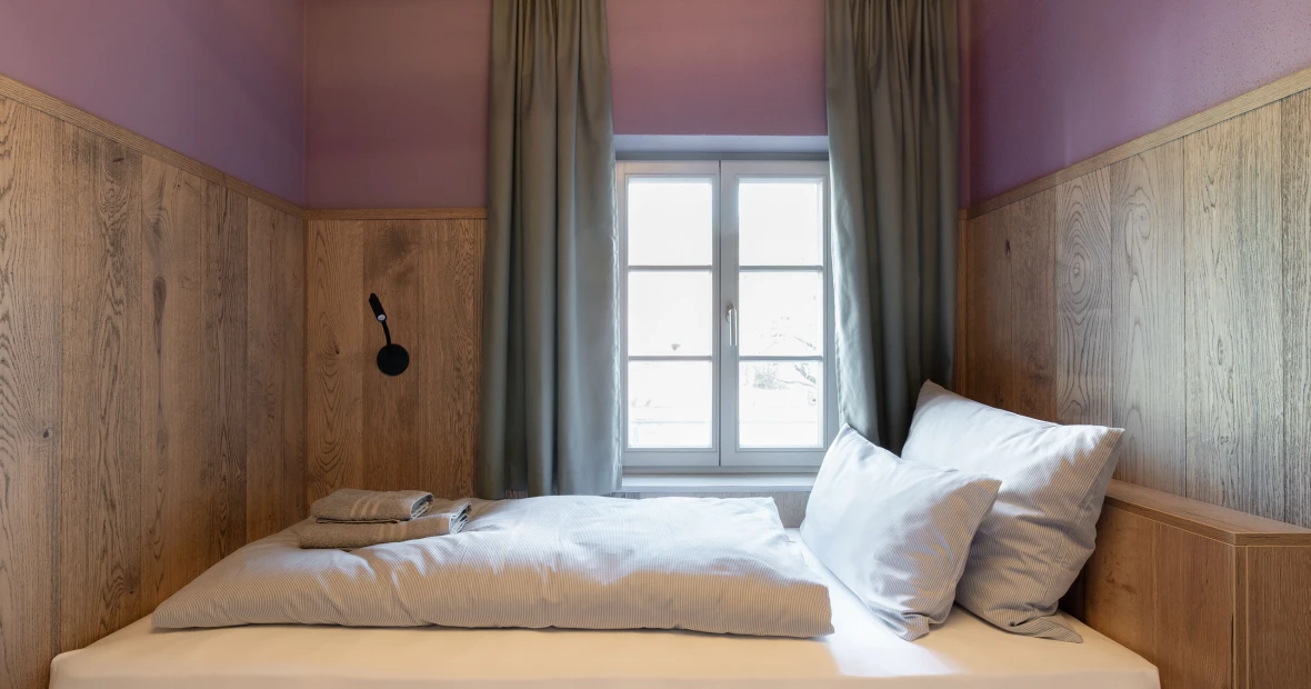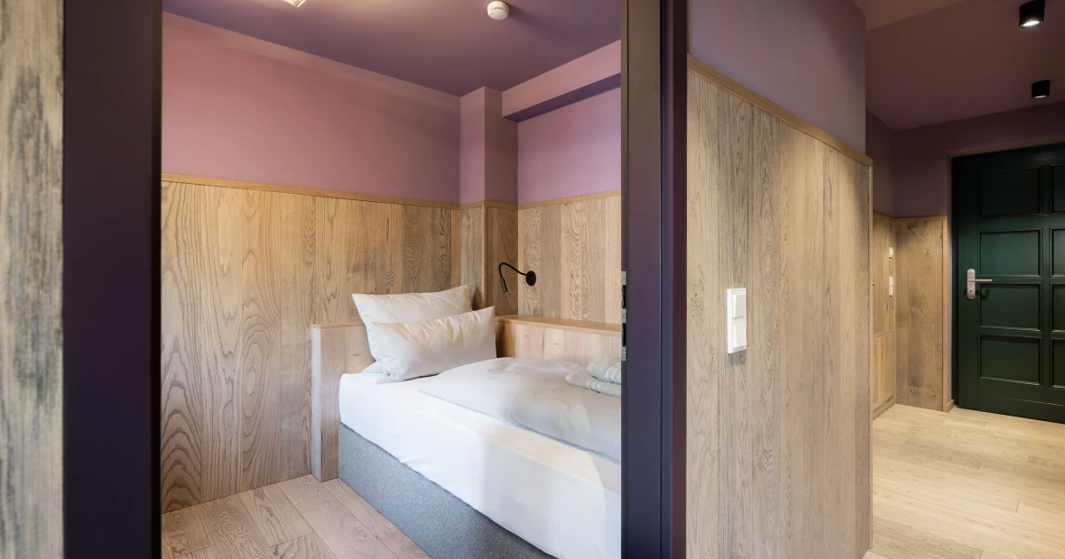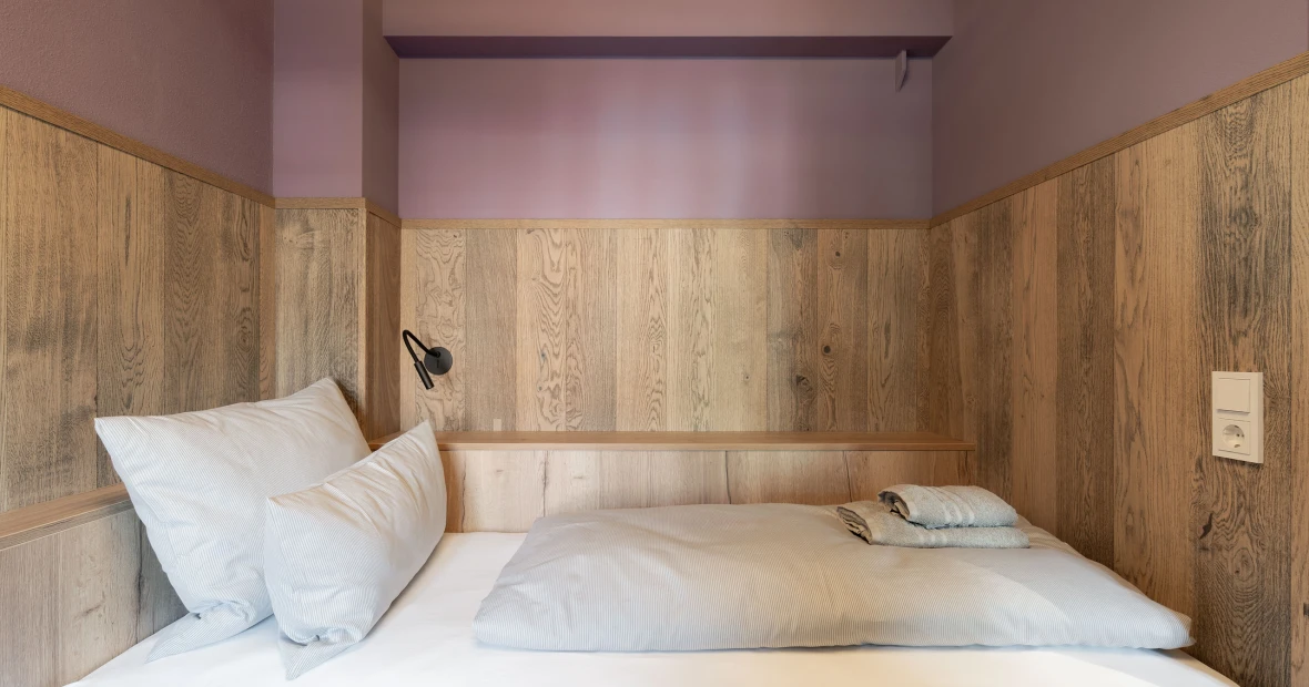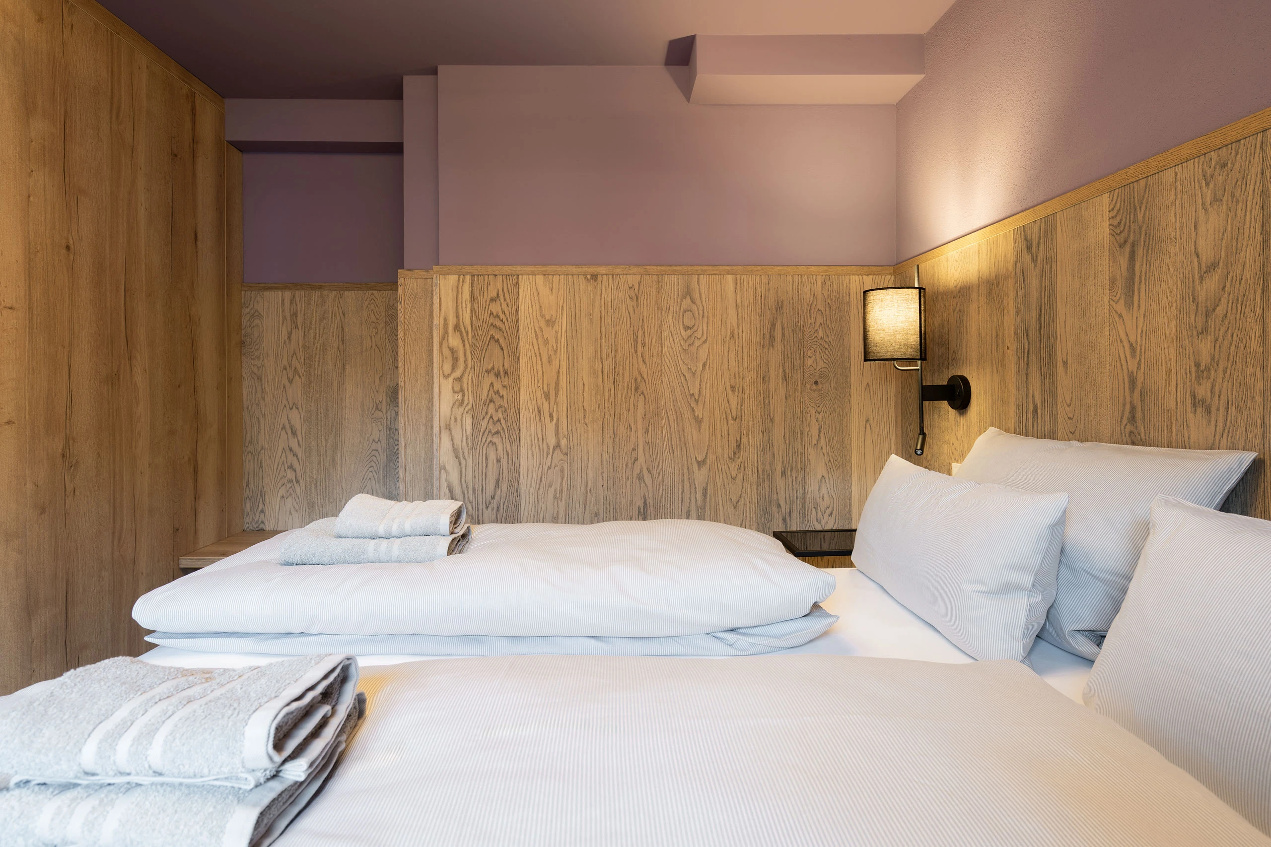 Zwei getrennte Einzelbetten ergänzen sich zu einem Quartier für vier. Durchdacht und praktisch, mit Blick für Privatsphäre. Das Bad mit Tageslicht bringt Frische, die klare Raumaufteilung sorgt für innere Ordnung. Ideal für ruhige Nächte nach lebendigen Tagen.