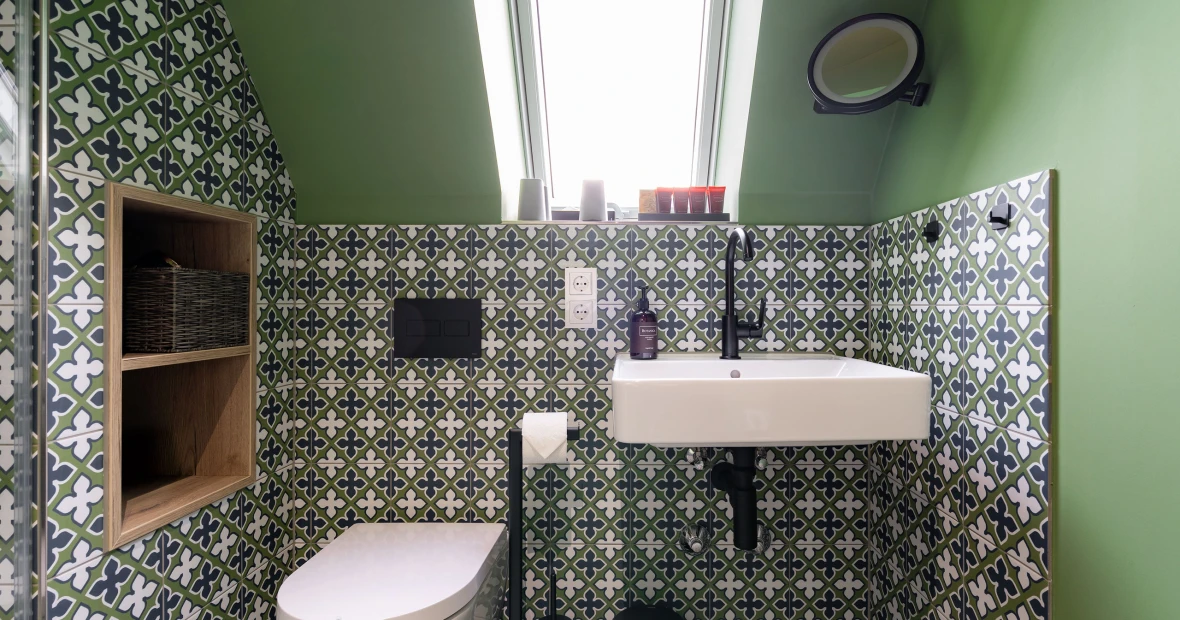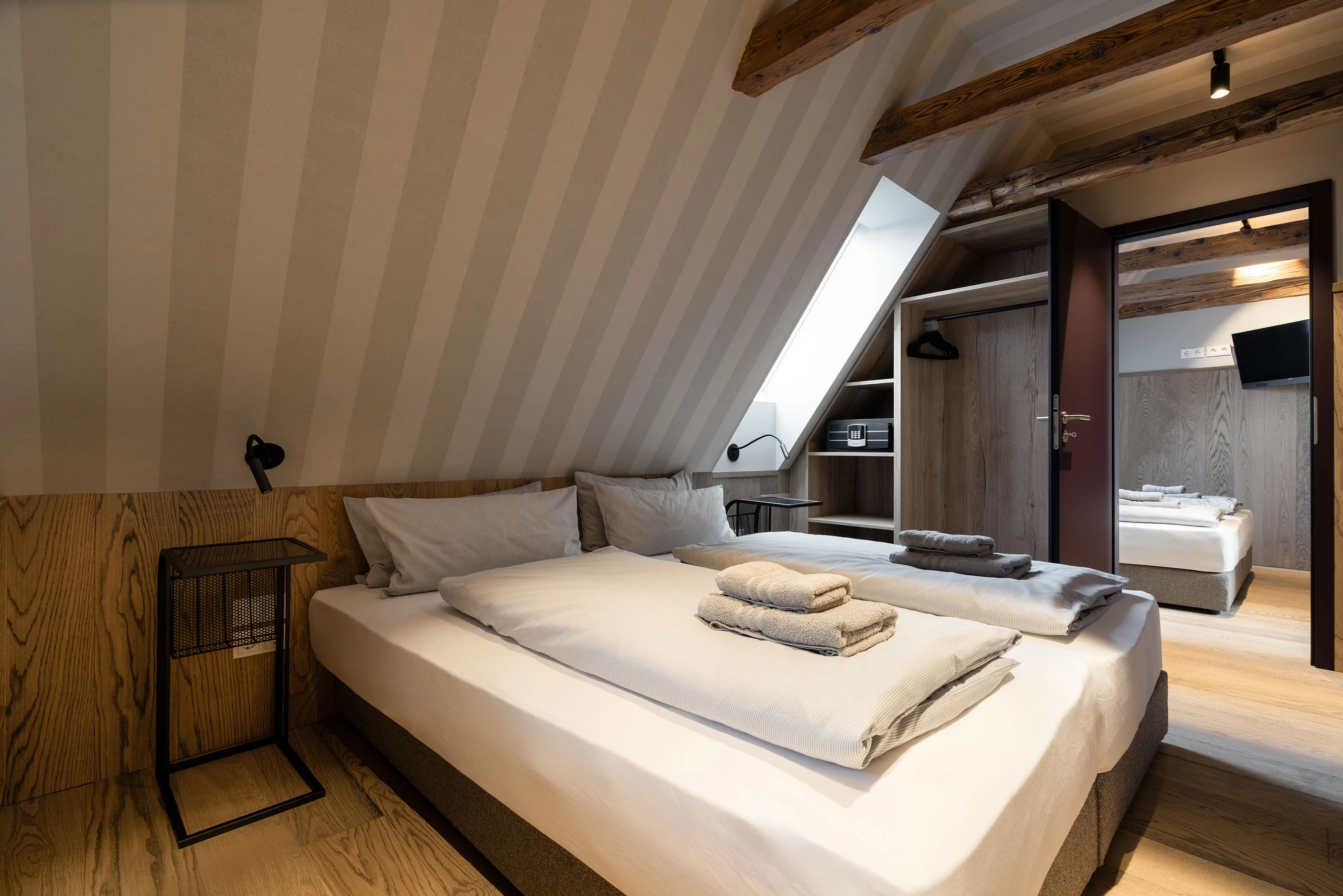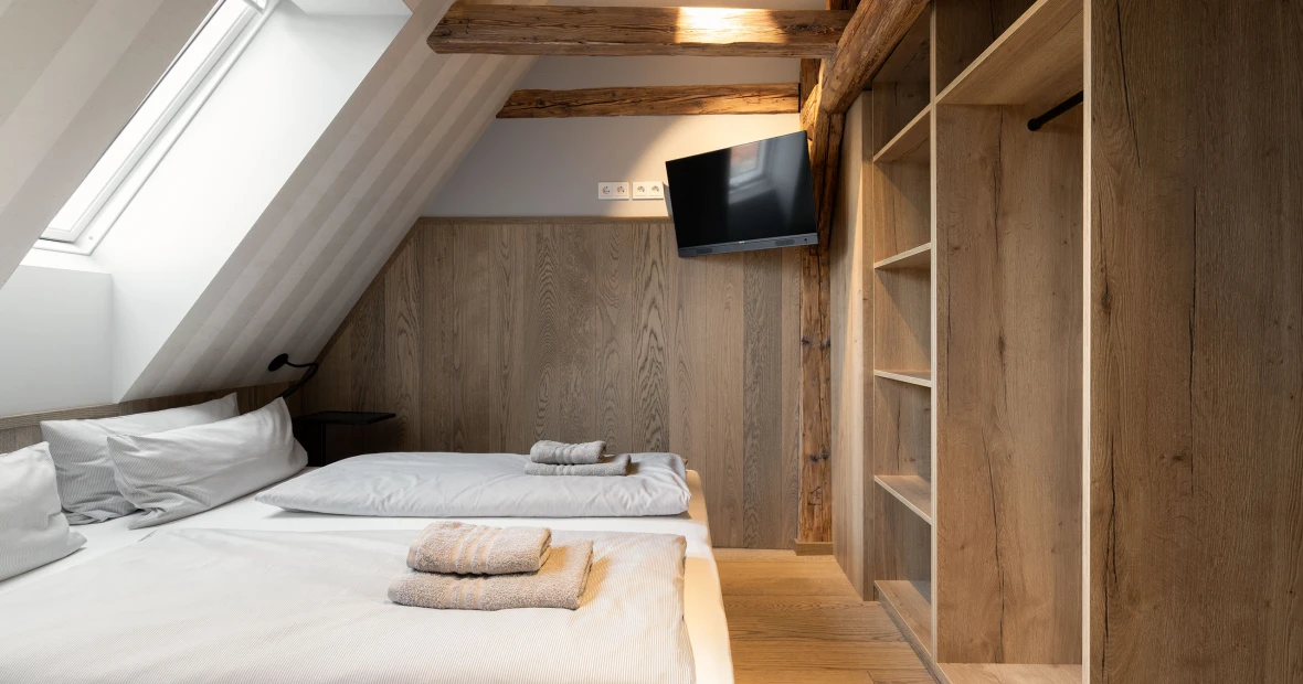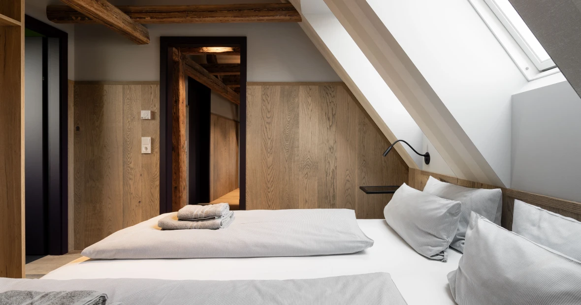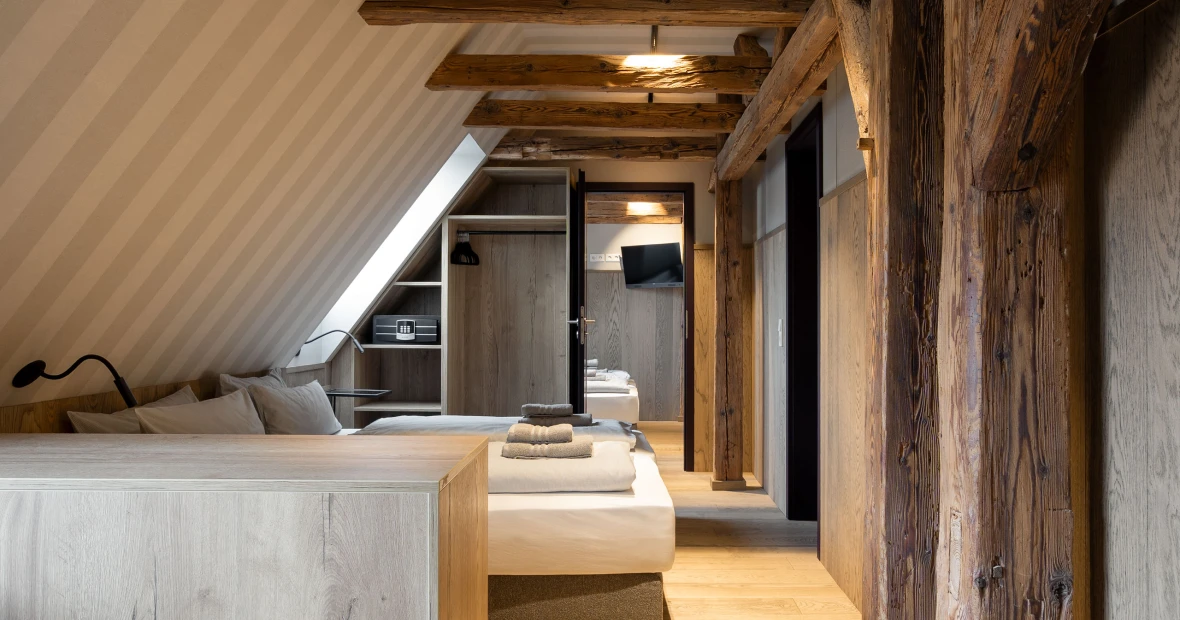 Hoch oben unterm historischen Dach entfaltet sich ein besonderer Rückzugsort: warmes Holz, sichtbares Tragwerk aus alten Balken, ein weicher Holzboden – alles durchdrungen von Licht und Weite. Die großzügige Gaube eröffnet einen atemberaubenden Blick über die „Schöne Höhe“. Zwei Bäder bieten Komfort, der separate Wohnbereich mit Sofa und TV lädt zum Verweilen ein. Hier ist Platz für bis zu sechs Personen – und genug Raum für Ruhe, Gespräche, Gedanken und Geschichten. Ein echtes Refugium über den Dingen.